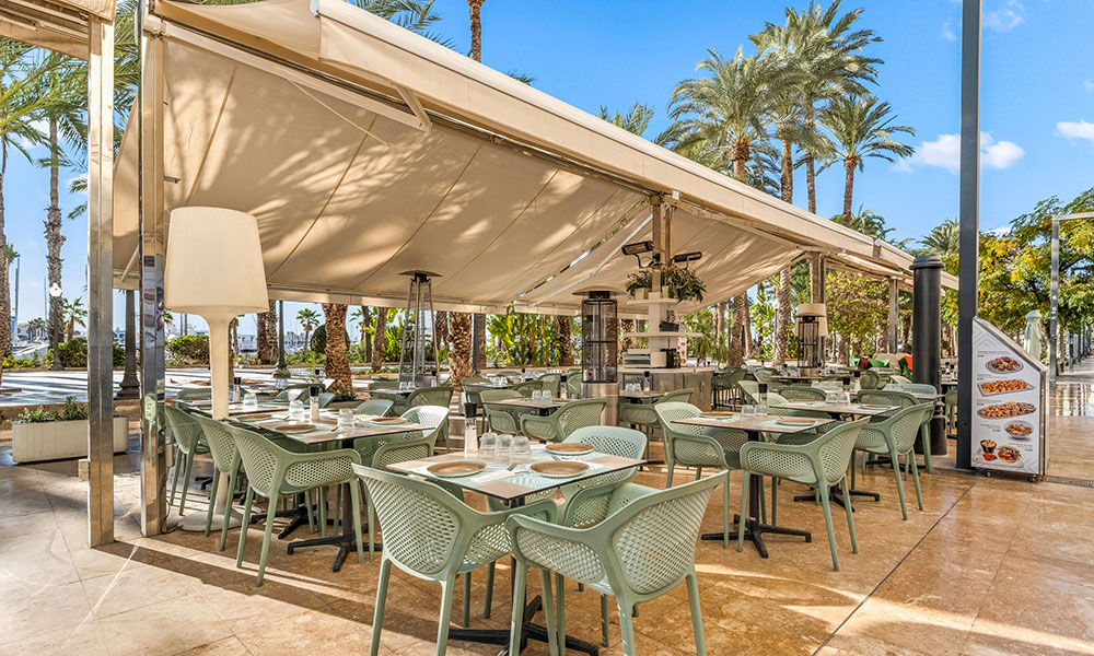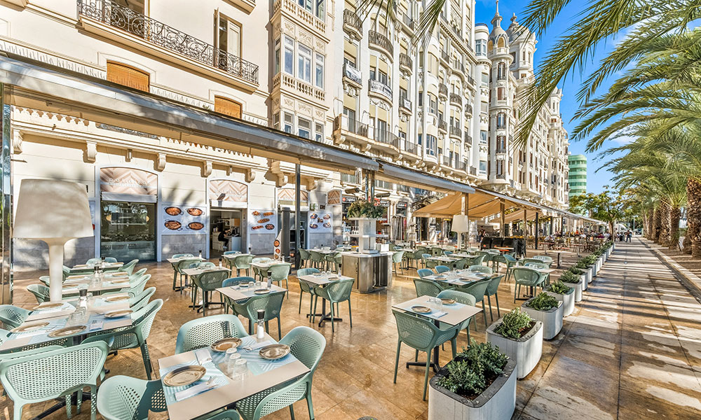 En el exterior disponemos de una amplia terraza en la Explanada de España, sin duda el espacio más solicitado por nuestros clientes. Desde ella se disfrutan de unas vistas privilegiadas del paseo más emblemático de nuestra ciudad.